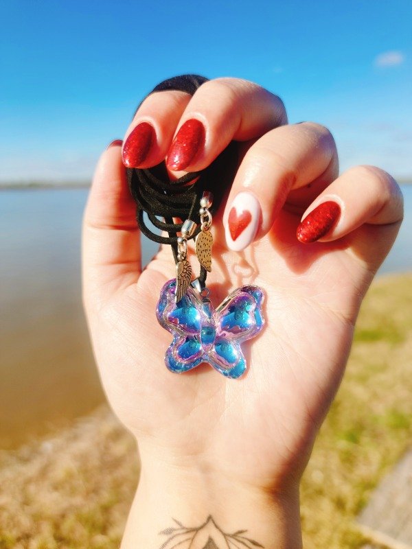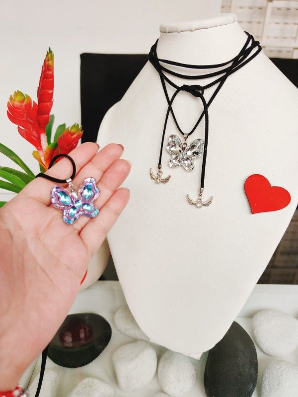 Collar de cordon gamuzado color negro, con mariposa de cristal facetado tornasolada en colores lila y azulinos, de 3cm x 3cm. Los dijes de los extremos pueden variar. Largo del cordón 1,5m.