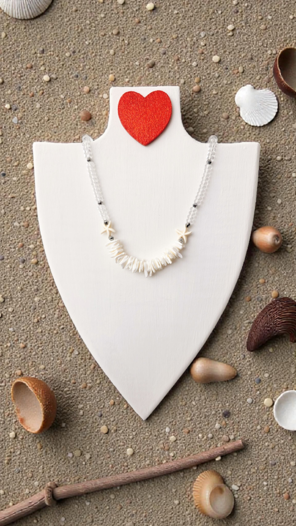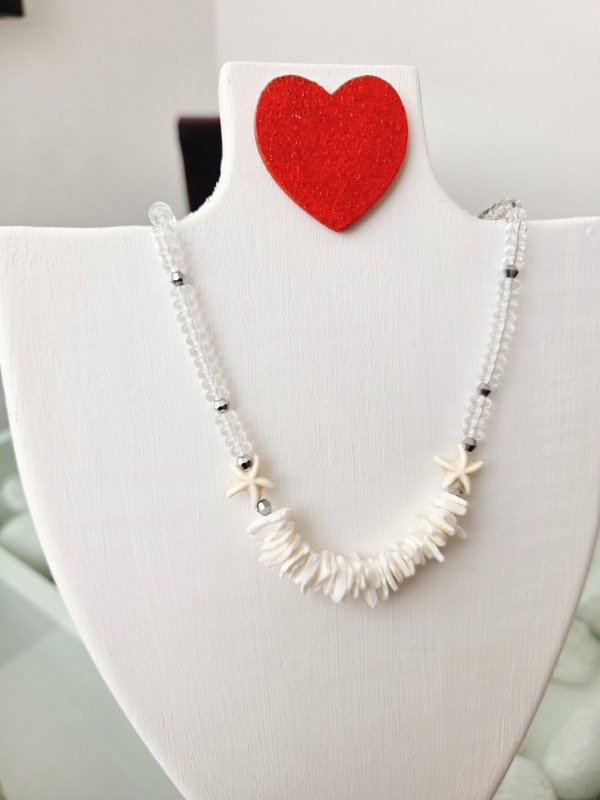 Collar hecho de donas transparentes con pasantes de cristal de roca en plateado, dijes de estrella de mar se resina, y escallas simil caracol. Muy para usar todo el verano! 🏝
