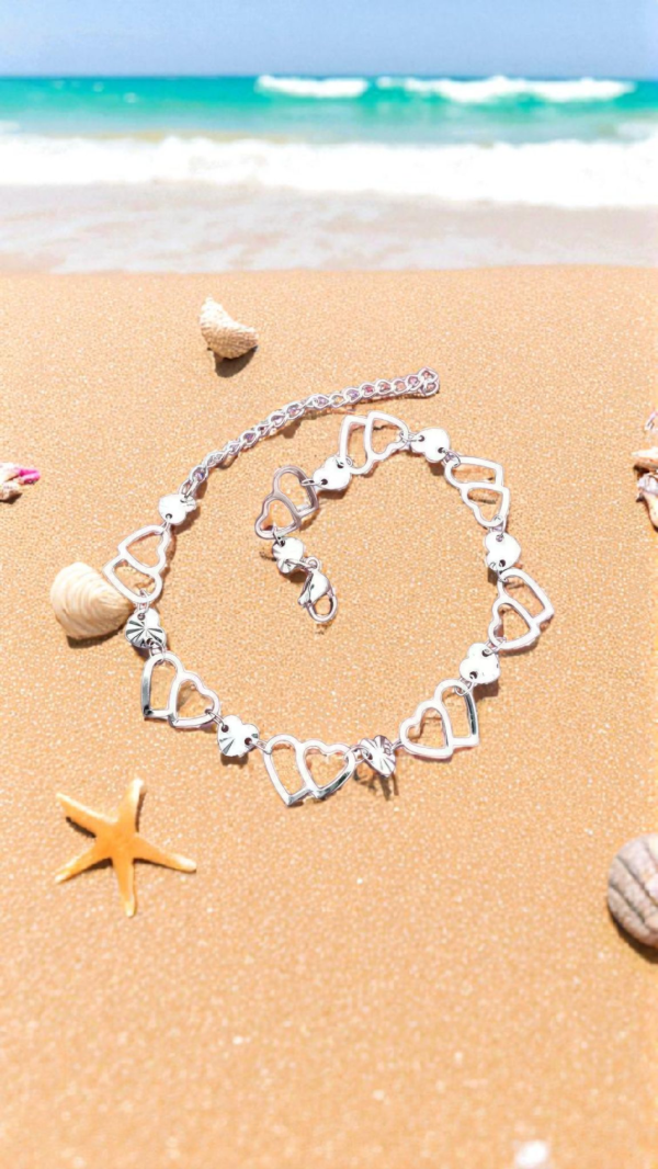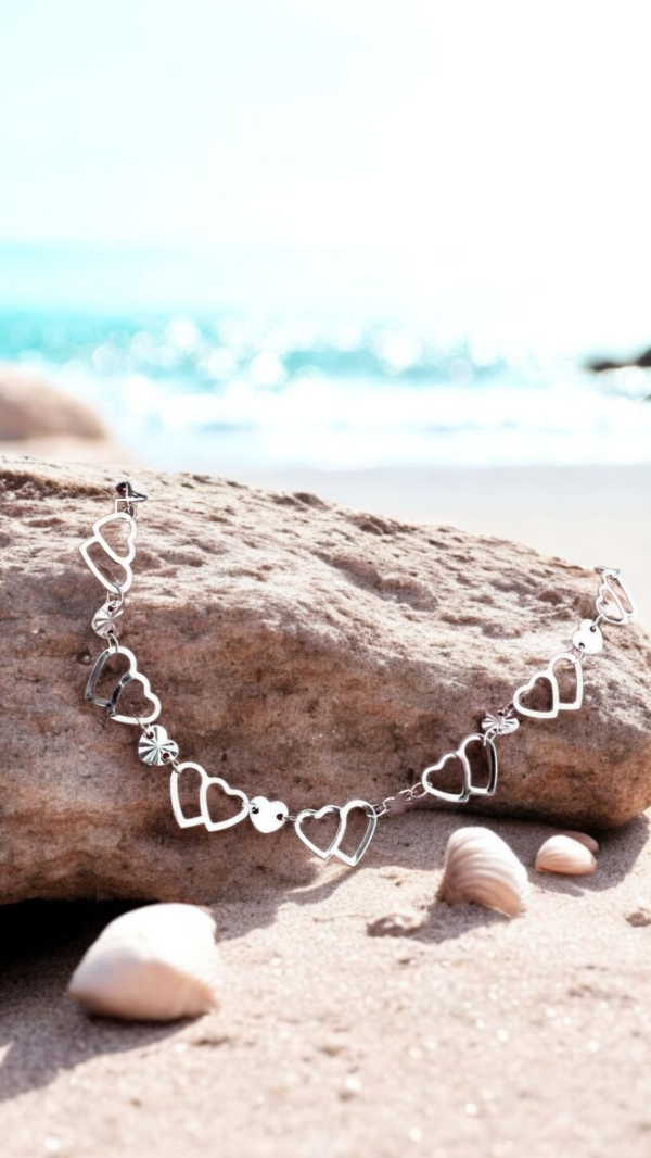 Tobillera de cadena de acero blanco con eslabones intercalados de corazones.