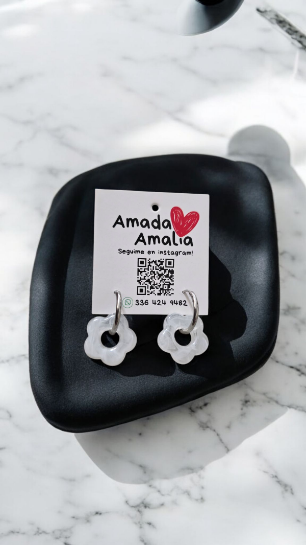 Aros de acero quirurgico tipo argolla con flores de acrilico transparentes con betas blancas pasantes.