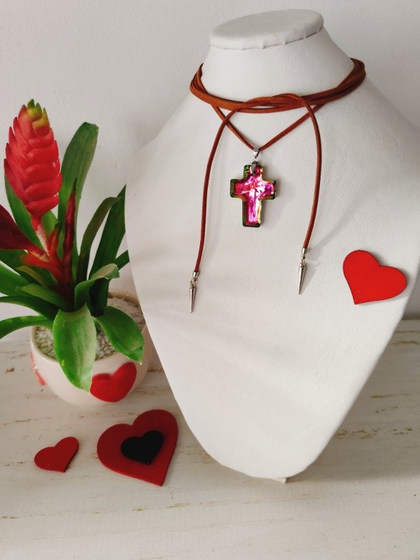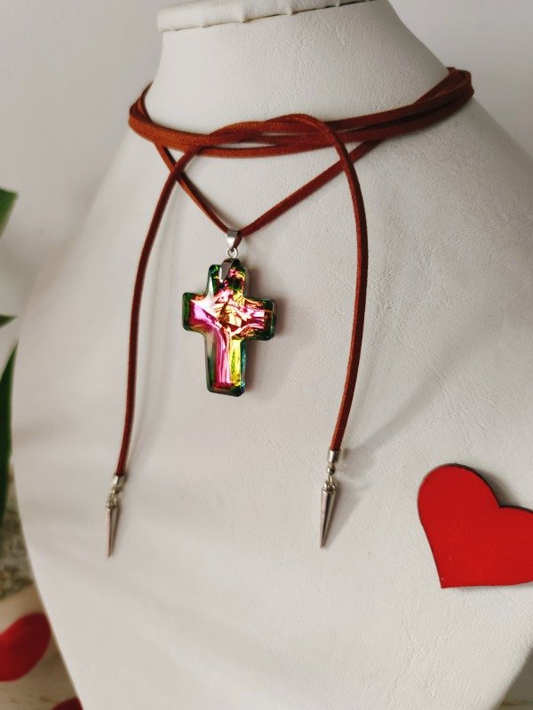 Collar de cordon gamuzado color suela, con cruz XL de cristal facetada transparente tornasol. Los dijes de los extremos pueden variar. El largo es 1,5m.