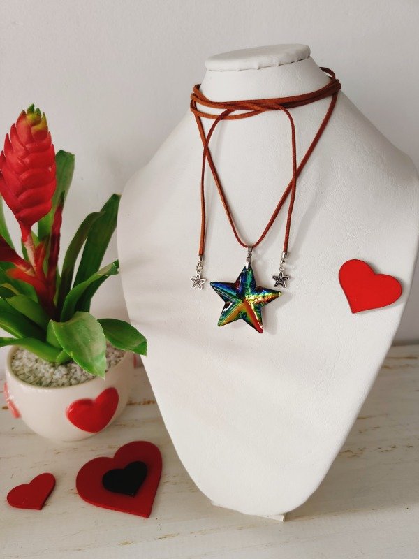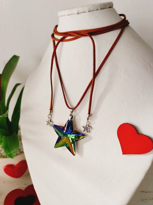 Collar de cordon gamuzado color suela, con estrella de cristal tornasol en varios colores. Los dijes de los extremos pueden variar. El largo es 1,5m.