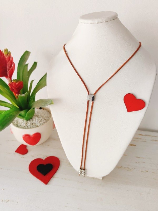 Collar de cordon gamuzado blanco, con corazon de cristal facetado transparente tornasol. Los dijes de los extremos pueden variar.