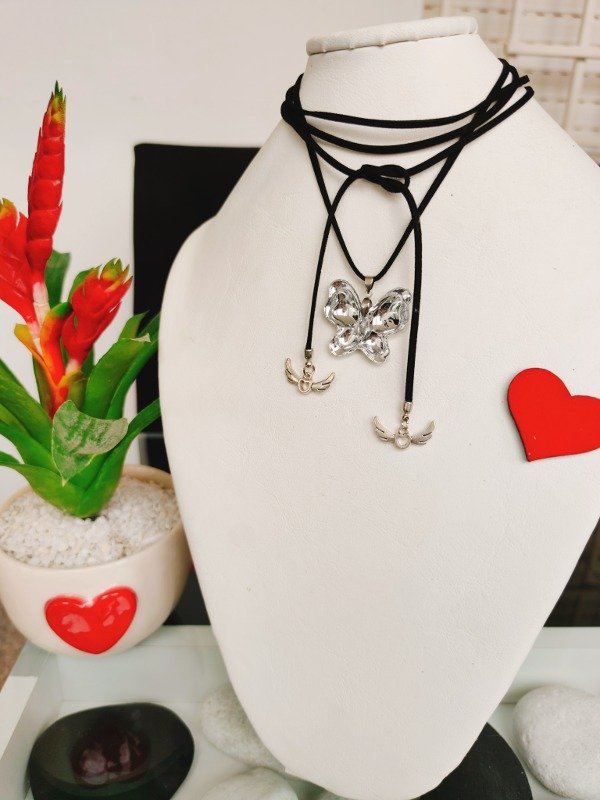 Collar de cordon gamuzado color negro, con mariposa de cristal facetado color plateada de 3cm x 3cm. Los dijes de los extremos pueden variar. Largo del cordón 1,5m.