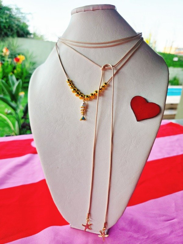 Choker hecho en hilo engomado color natural, con cuentas doradas y dije de metal en forma de pez, combinando dorado, natural, mostaza, y celeste.