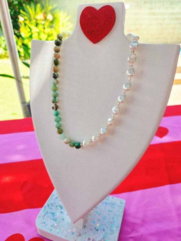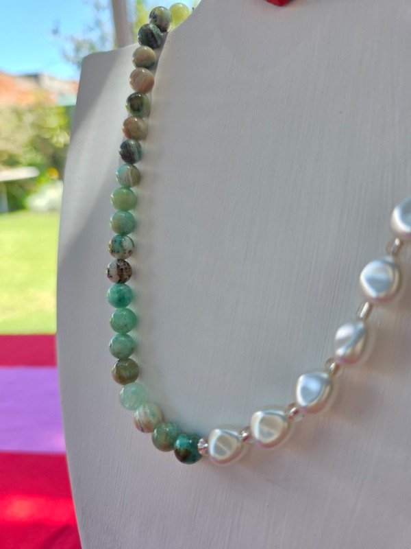 Collar de piedra natural Aragonito verde, mostacillas y simil perlas de río. Una verdadera belleza.