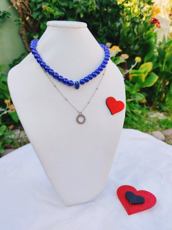 Modelo compuesto por dos collares que se pueden separar, o sea, los podes usar juntos o por separado. El primer collar es de perlas azules grandes, con una piedra lapislázuli en el medio. El segundo collar es una cadena finita con mini pelotitas intercaladas y dije de circulo.