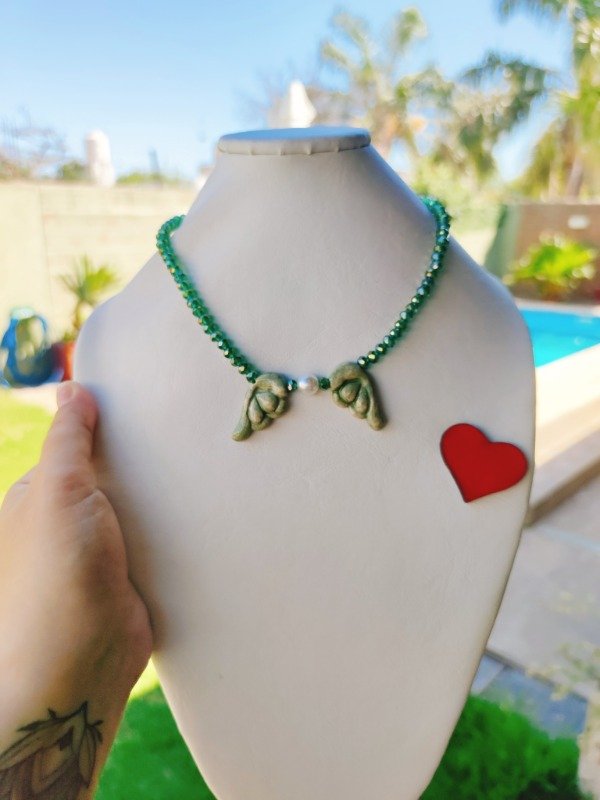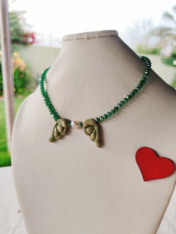 Collar de cristales de roca en color verde botella tornasolado, con dijes de alitas de cerámica al tono y perla grande en el medio.