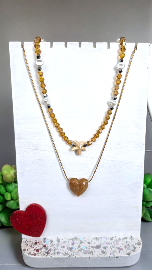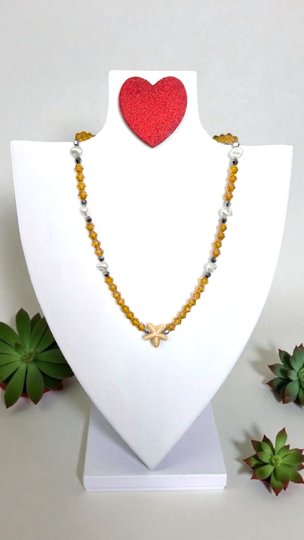 Collar de cristales de roca bicono en color dorado, combinado con perlas de rio, cristales en plateado y dije de ceramica al tono. Ideal para usar todo el verano y llevarlo a la pile, se puede mojar!. Tiene cadenita para extender.