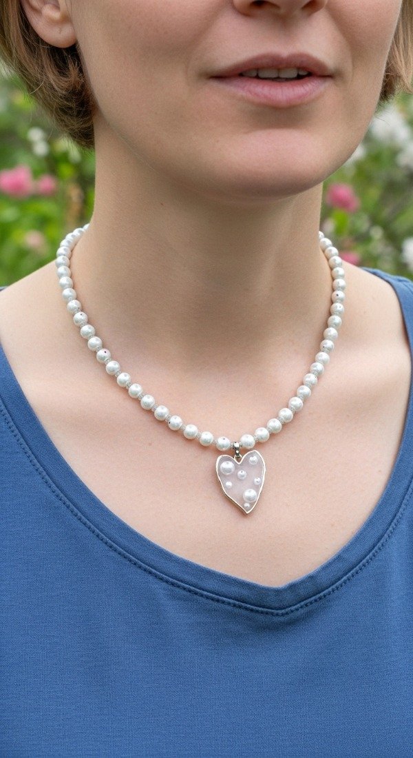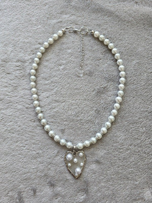 Collar es de perlas de vidrio en color blanco con pasantes plateados, dije de corazon transparente con borde plateado e incrustacion de perlas. Tiene cadenita para regular su largo.