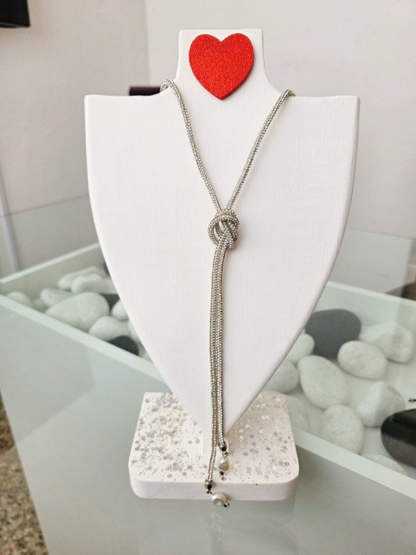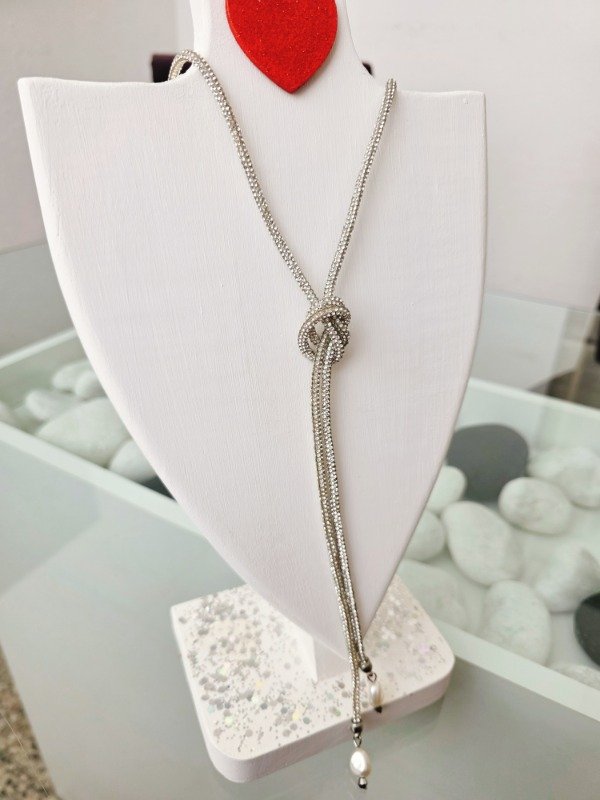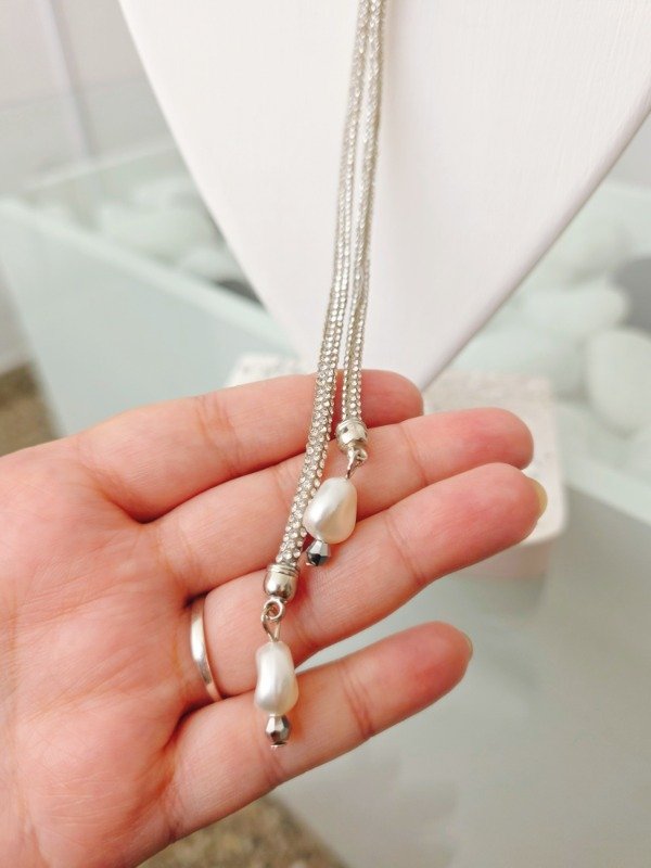 Collar de cordón de strass en color plateado, es una tira larga que mide 1m y le podes dar las vueltas o nudos que mejor queden con tu outfit. Las punteras son perlas de río con cristalito de roca.