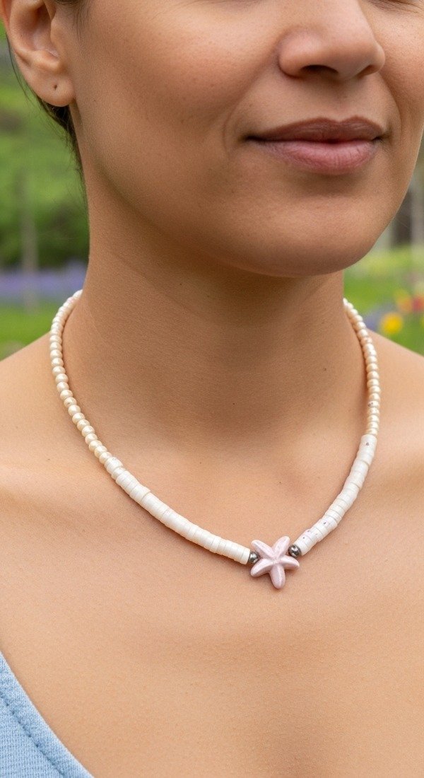 Collar de cristalitos de roca en tonos nude, fimo al tono con un destello y dije de estrella de mar de cerámica al tono. Se puede mojar.