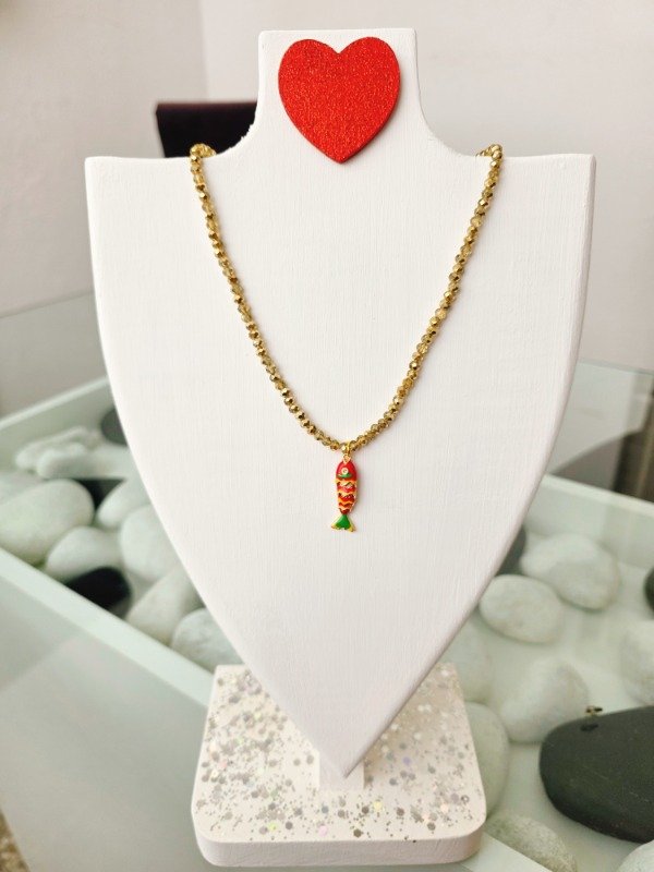 Collar de cristal de roca dorado metalizado, con pez de colores.